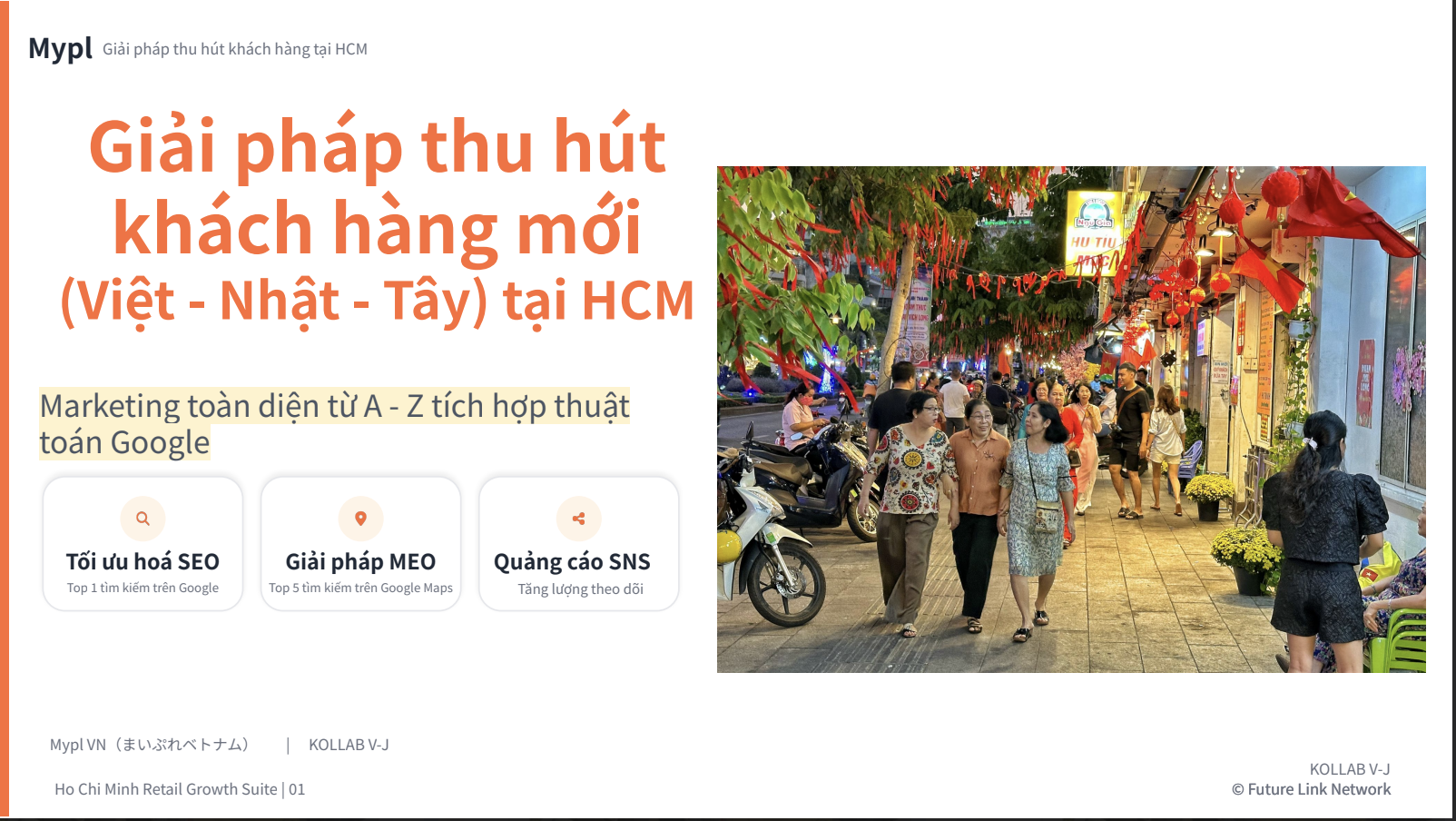 Kollab V-J — công ty quảng cáo tại Việt Nam — chính thức giới thiệu dịch vụ truyền thông số tích hợp thông qua nền tảng MYPL, được phát triển bởi đội ngũ marketing kỹ thuật Future Link Network (Nhật Bản). Giải pháp này giúp doanh nghiệp xây dựng trang thông tin riêng, quản lý nội dung tập trung và đồng bộ hiển thị trên Google Maps, Instagram, Facebook và website.